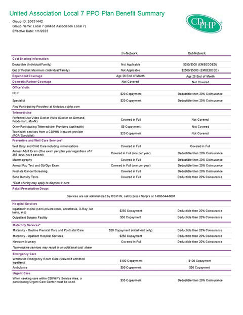 View your key benefits through Local 7 - Summary of Benefits, CDPHP and Delta Dental PPOs, Summary Annual Reports, CHIP Notice, and more.